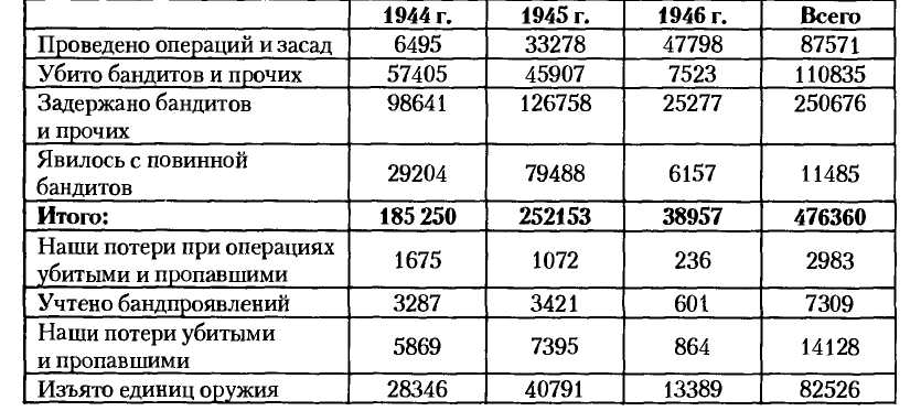О напряженности борьбы с националистическим подпольем свидетельствует число докладов, поступавших из НКВД-МВД СССР на имя руководителя страны И.В. Сталина. В марте-декабре 1944 г. таких докладов было 52, в 1945 г.-105, в 1946 г.-52.