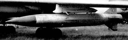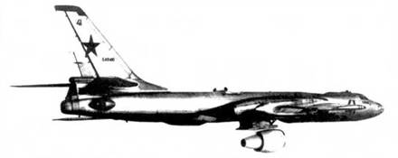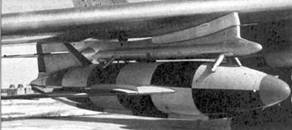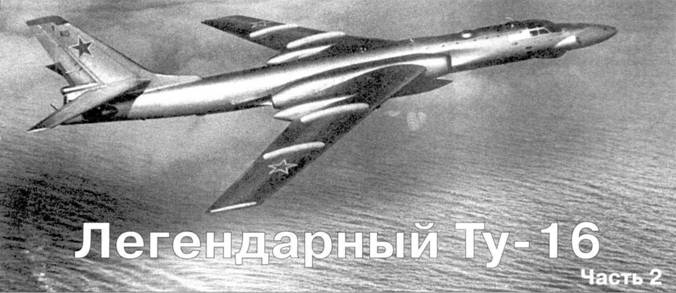 Ту-16КСР-2 <Ту-16К-16). Дальнейшим развитием КСР стала ракета КСР-2, которая в сочетании с носителем Ту-16 и системой наведения «Рубикон» образовала комплекс К-16, предназначенный для поражения радиолокационно-контрастных морских и наземных целей: кораблей, мостов, плотин, электростанций, заводов, железнодорожных узлов, аэродромов и т.п. Она оснащалась ЖРД типа С5-6 с тягой до 1200 кгс в момент пуска и до 700 кгс на маршевом режиме. На КСР-2 устанавливалась система радиоуправления с бортовым локатором КС-ПМ, связанная с самолетной РЛС «Рубин-1 К». Длина ракеты - 8,62 мг размах крыла -4,52 м, стартовая масса - 4077-4100 кг, масса боевой части - 840-850 кг, максимальная скорость - 1260 км/ч и дальность полета - 120-150 км.