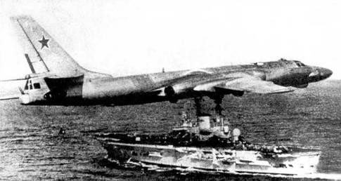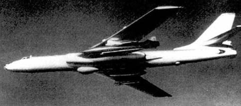 Ту-16К-10. Еще в 1950-х гг., развивая идеи, заложенные при создании системы «Комета», ОКБ Микояна совместно с ОКБ Туполева приступили к разработке новой системы дальнего действия К-10, предназначенной для уничтожения надводных целей водоизмещением более 10000 т. Основой комплекса стала ракета К-10С со среднерасположенным стреловидным крылом и стреловидным оперением. Для комплекса К-10 проектировалась система наведения и управления К-10У, базировавшаяся на самолетной радиолокационной станции ЕН с дальностью обнаружения цели порядка 400 км. На ракете устанавливались станции: ЕС-2Д, служившая для наведения при помощи сигналов, поступающих от РЛС самолета-носителя, а также для выдачи команд по изменению траектории К-10С в вертикальной плоскости в соответствии с заданной программой; ЕС-1, предназначавшаяся для управления полетом после перехода в режим самонаведения. Характерной особенностью полета К-10С к цели являлось маневрирование в горизонтальной и вертикальной плоскостях. После отцепки от носителя на дальности более 120 км до цели ракета «просаживалась», затем входила в луч самолетной РЛС и летела горизонтально. На дистанции 100-110 км она переходила к снижению сначала под углом 14-16\ а затем - 3-8". За 60-70 км до цели ракета снова выходила в горизонтальный полет, но уже на высоте 800-1000 м. На расстоянии 10-16 км до цели она захватывалась головкой самонаведения, ракета снижалась и выходила на объект атаки на высоте в несколько метров, нанося удар в борт или по подводной части корабля.