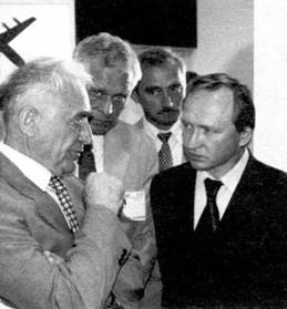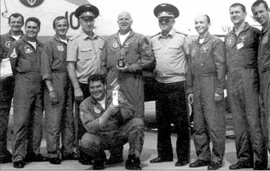 Украинские летчики - участники авиашоу ROLAS-2001. В центре - командир группы «Украинские соколы» подп-к В.Росошанский, слева от него - генерал-л-т А.Волошенко, справа - генерал-м-р Ю.Тишков.