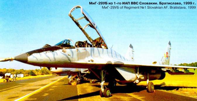 Еще в 1976 г. вышло Постановление правительства СССР о создании двухместного учебно-боевого самолета МиГ-29УБ. В ОКБ машине присвоили индекс «9-51». Но в то время все усилия ОКБ были сосредоточены на основном варианте машины, и эскизное проектирование спарки началось лишь через два года. Вторую кабину разместили за счет сокращения состава оборудования, РЛС сняли, заменив ее имитирующими устройствами. Комплекс ОЭ ПрНК-29УБ отличался от установленного на боевом самолете дублированием органов управления и, частично, индикации. Положительной особенностью МиГ-29УБ стал превосходный обзор из обеих кабин.