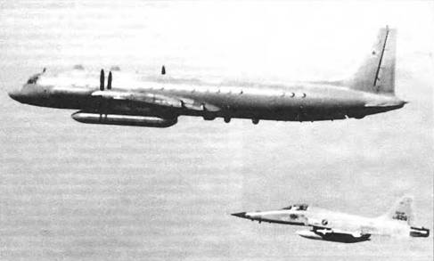 Южнокорейский F-5 сопровождает советский самолет-разведчик Ил-20, направляющийся в сторону Владивостока