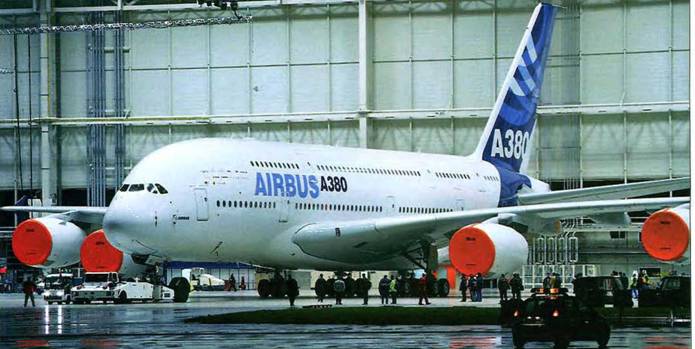 18 января состоялась выкатка из сборочного цеха Производственного комплекса им. Жан-Люка Лагардера концерна Airbus в Тулузе самого большого в мире пассажирского самолета А380. По планам он должен подняться в небо в конце марта 2005 г.