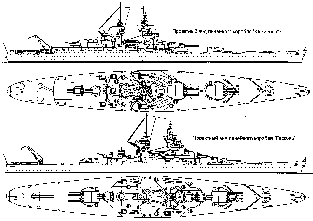 Для Франции это мало что значило, поскольку разработка нового проекта требовала значительного времени, а обстановка в Европе накалялась с каждым месяцем. После подписания Мюнхенского соглашения, которое практически развязывало руки Гитлеру для прямых агрессий в соседние страны, французы решили заказать еще два линкора по 35000 т, получивших названия «Клемансо» и «Гасконь». Первый собирались заложить на Брестской военной верфи сразу после спуска «Ришелье», второй — на верфи Шантье де ла Луар в Сен-Назере сразу после спуска «Жана Бара». К этому времени все уже ясно понимали возросшую угрозу воздушных атак, поэтому необходимость в усилении «чисто» зенитного вооружения не вызывала сомнений. Тем более, что заряжание 152-мм орудий, поспешно названных «универсальными», при угле возвышения свыше 75° вызывало определенные трудности. Пришлось снизить указанный в проектных требованиях угол в 90° до 75°, а зенитное вооружение дополнить проверенными 100-мм спаренными установками за счет снятия двух 152-мм башен в средней части. Сначала хотели обойтись без последней меры, но весовые соображения и недостаток места для получения хороших углов обстрела заставил эти башни снять. Увеличивалось и число 37-мм автоматов — еще две спаренные закрытые установки помещались сразу перед 2-й башней ГК.