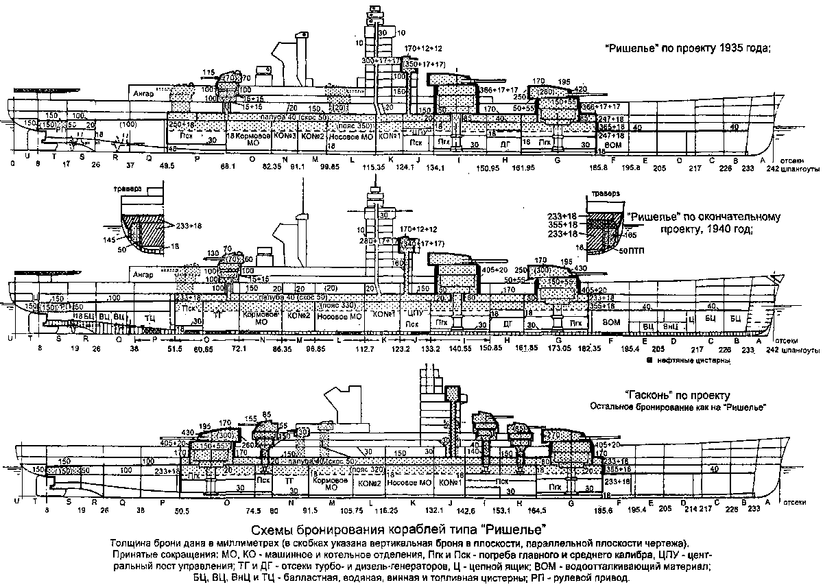Защита — пояс 360 мм с наклоном 11,3°, главная палуба 160+15, нижняя 40, скосы 50; противоторпедная как на «Дюнкерке»