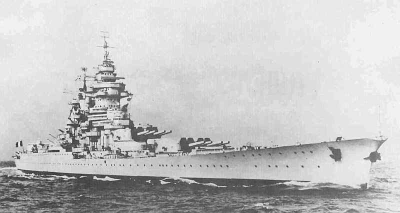 Конечно, все эти, почти что восторженные, отзывы не удалось подтвердить на практике. И «Ришелье», и «Жану Бару» только по одному разу удалось принять участие в артиллерийских дуэлях с линкорами противника (а вернее — бывших союзников, к которым французы в конце концов не могли не примкнуть). И эти перестрелки никак нельзя было назвать решительным боем «до победного конца». Фактически это были поединки «до первой крови». Для французских линкоров из-за их неполной боевой готовности (про «Жан Бар» это еще мягко сказано!) верхом успеха считалось бы даже единственное попадание. А перед англичанами и американцами вовсе не стояла задача потопить «Ришелье» или «Жан Бар» — достаточно было просто их временно нейтрализовать. Повреждения «Жана Бара» от огня «Массачусетса» действительно выглядели серьезными. Но, во-первых, еще неизвестно, скольких бы попаданий добились американцы, если бы французский линкор маневрировал на высокой скорости, удерживая выгодные для себя, а вовсе не для противника, дистанцию и пеленг, и отвечал своими мощными залпами. А во-вторых, наличие на линкоре штатного и хорошо подготовленного экипажа, а также всех устройств и систем борьбы за живучесть безусловно уменьшило бы эффект от наносимых снарядами повреждений. К тому же можно задать вопрос: а какому еще линкору довелось испытать на себе воздействие мощнейших 406-мм американских снарядов, весивших почти тонну с четвертью и имевших огромную разрушительную силу? Даже загнанный британским флотом «Бисмарк» получал попадания 406-мм снарядов с «Родни», которые были на 150 кг легче и обладали гораздо меньшей бронепробиваемостью и разрывным воздействием. А пример с «Кирисимой» вообще не следует принимать в расчет — броня устаревшего японского корабля на боевых дистанциях пробивалась главным калибром любого линкора. Так что «Жан Бар» оказался вполне молодцом, сумев после 5–7 406-мм попаданий остаться в строю, если это выражение можно применить к кораблю, ошвартованному у стенки набережной.