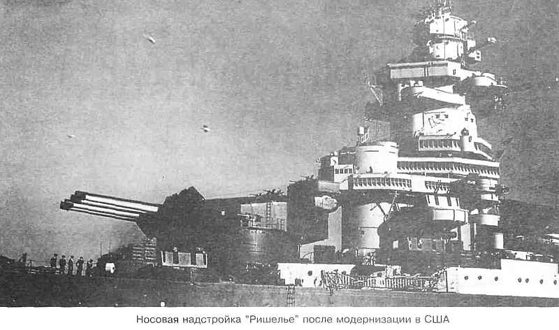 Боевой опыт «Ришелье» и, особенно, атаки американских кораблей японской авиацией показали несоответствие исходного положения надстройки. В бою командир корабля имел только ограниченный обзор, поэтому было решено переделать боевую рубку, расширить верхние мостики, главный пост управления и ходовую рубку, которую легко забронировали.
