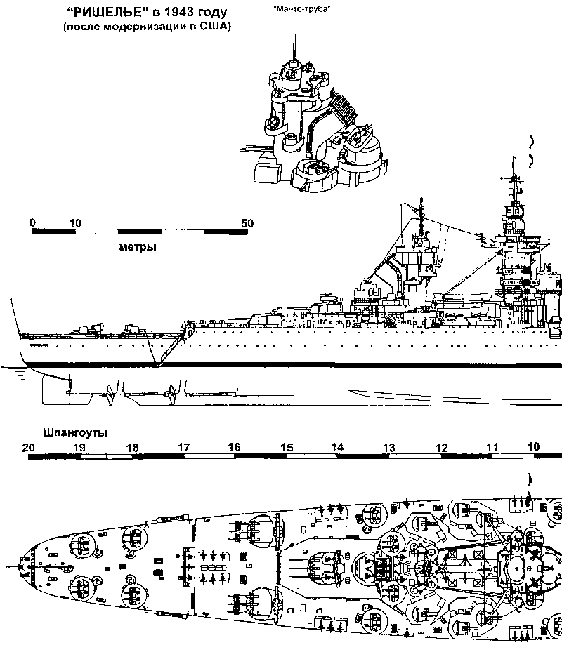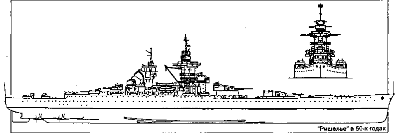 «Ришелье» в 1945 г.: 8 361/45, 9 1.52/55,12 100/45, 67 40-мм, 41 20-мм, 4 учебных, 4 салютных;