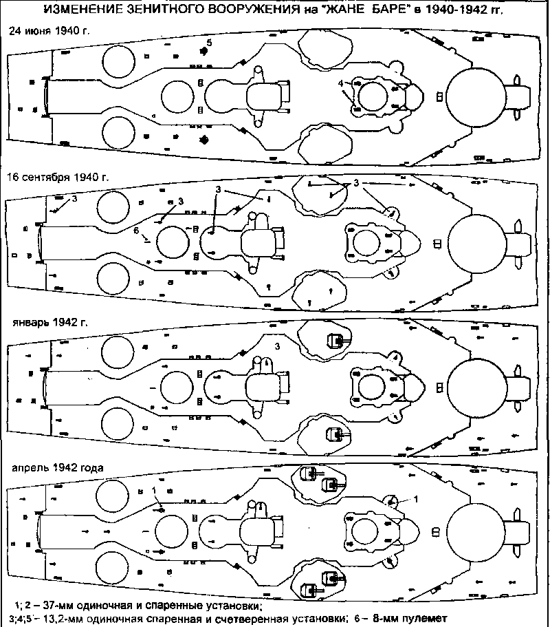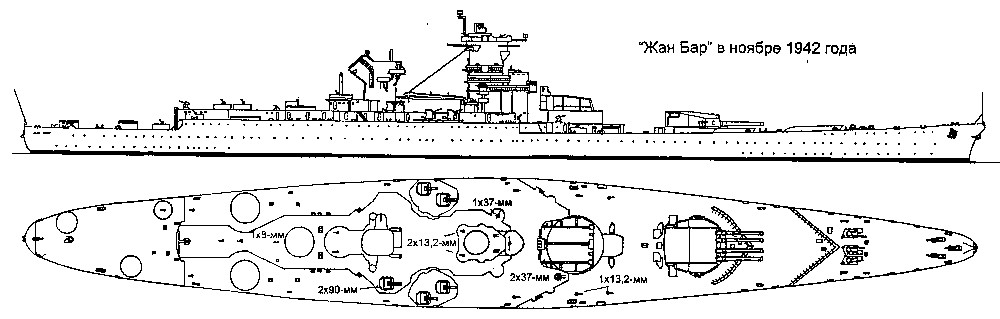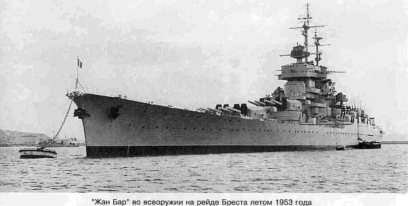 «Жан Бар» в 1950 г.: 8 380/45, 9 152/55, 8 40-мм, 20 20-мм, 4 учебных 90-мм;