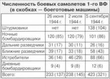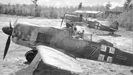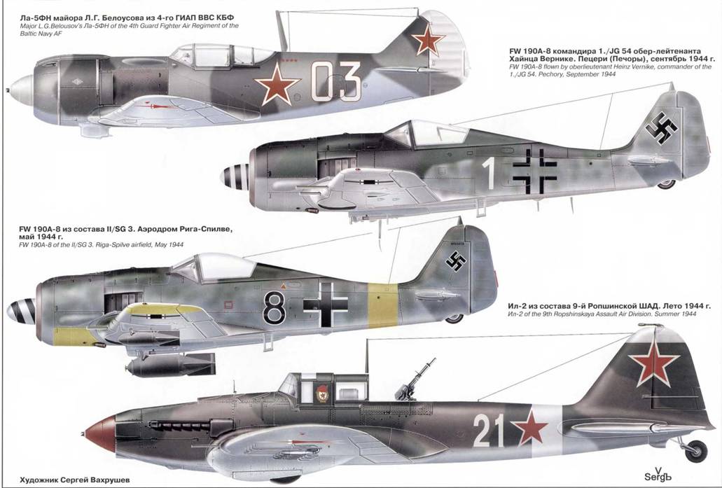 К началу операции «Багратион» 1-й ВФ располагал одной штурмовой эскадрой (Schlachtgeschwader 3). перевооружавшейся с пикировщиков Ju 87 на штурмовики «Фокке-Вульф 190», и двумя группами 54-й истребительной эскадры Grunherz. В боевом составе флота находилось также большое количество подразделений ночной бомбардировочной (штурмовой – по немецкой классификации) авиации, впрочем, имевших достаточно ограниченную боевую ценность. Единственный отряд «настоящих» бомбардировщиков Не 111 из 14(Eis.)/KG 55 использовался исключительно для ночных рейдов против железнодорожных коммуникаций в советском тылу. Прорыв советскими войсками линии Ман-нергейма и необходимость удержать своего союзника от выхода из войны заставили немцев перебросить на аэродромы Южной Финляндии крупные силы 1 -го ВФ. Там они понесли ощутимые потери, лишившись 13 «Фокке-Вульфов» и 13 «Юнкерсов», и потрепанными вернулись из «командировки» к началу активных действий ВВС КБФ над Чудским озером. Кроме того, на прибалтийские базы перелетела оснащенная FW 190 группа I./SG 5. которая также побывала в стране Суоми, а до того действовала на Крайнем Севере. В начале июля 1-й ВФ был пополнен переброшенной из Италии полнокровной 4-й штурмовой эскадрой, на вооружении которой находились FW 190 различных модификаций.