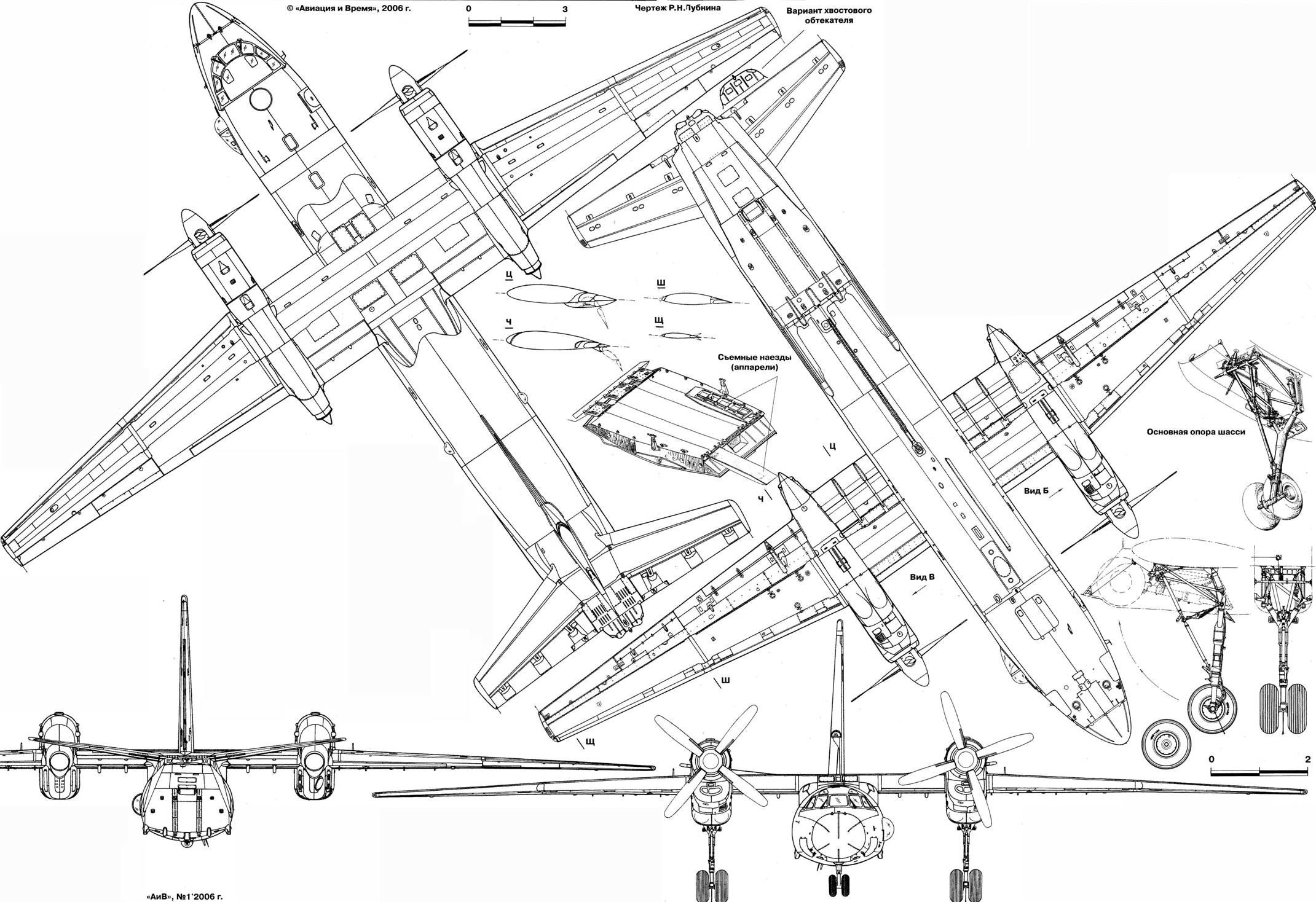 Силовая установка самолета состоит из двух турбовинтовых двигателей АИ-20Д 5-й серии с четырехлопастными воздушными винтами изменяемого шага АВ-68ДМ, вспомогательной силовой установки ТГ-16М и систем, обеспечивающих их работу. Двигатель АИ-20Д выполнен по одновальной схеме и состоит из планетарного редуктора, осевого десятиступенчатого компрессора, кольцевой камеры сгорания, осевой трехступенчатой турбины и нерегулируемого реактивного сопла. Мощность двигателя на взлетном режиме (в условиях МСА) – 5180 э.л.с., в крейсерском полете (Н=8000 м, V=530 км/ч) – 2800 э.л.с. Удельный расход топлива – 240 и 198 г/э.л.с. ч, соответственно. Длина двигателя – 3,1 м, сухая масса – 1040 кг. Управление двигателем – механическое. Двигатель располагается в мотогондоле над центропланом так, что его ось ориентирована под углом 4" к плоскости крыла. При помощи рамы и двух подкосов-амортизаторов двигатель крепится к силовому шпангоуту мотогондолы, который связан фермой с кессоном центроплана. Реактивное сопло двигателя телескопически соединено с удлинительной выхлопной трубой, изготовленной из титанового листа. Винт АВ-68ДМ – флюгируемый, диаметром 4,7 м. флюгирование его производится при необходимости летчиком либо системой автоматического флюгирования по крутящему моменту и отрицательной тяге. Винт не имеет реверса. Дополнительное торможение самолета на пробеге обеспечивается переводом лопастей винтов на минимальный установочный угол, что создает отрицательную тягу.