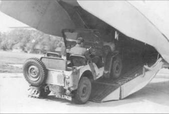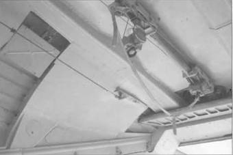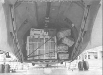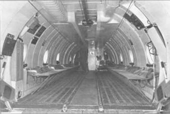 Погрузочно-разгрузочное и швартовочное оборудование. Самолет оборудован верхним и напольным погрузочными устройствами, а также системой блоков и тросом для загрузки несамоходной колесной техники. Верхнее погрузочное устройство грузоподъемностью 3000 кгс обеспечивает подъем груза с земли или борта автомобиля и перемещение его на пол грузовой кабины или роликовые дорожки 1П224 (если они установлены). Устройство состоит из монорельса, закрепленного на потолке кабины между шп. 29-39, двух кареток с крюками, перемещаемых по монорельсу вручную, и двух электролебедок. Напольное погрузочное устройство предназначено для перемещения платформ с грузом вдоль кабины и состоит из тяговой лебедки БЛ-56, закрепленной по левому борту грузовой кабины у шп. 9-10, и погрузочного троса. Несамоходная колесная техника, а также грузы массой более 3000 кг загружаются с помощью наземного тягача, троса и установленных в грузовой кабине блоков.