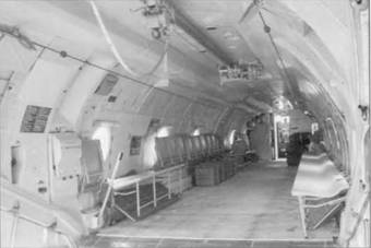 Гидравлическая система состоит из основной и вспомогательной систем, которые питаются из одного гидробака объемом 37 л. В качестве рабочей жидкости в системах используется около 65 л масла АМГ-10 или его зарубежных аналогов. Основная гидросистема предназначена для уборки-выпуска шасси, торможения колес и управления передней опорой, привода закрылков, нижнего аварийного люка и стеклоочистителей, флюгирования винтов и останова двигателей, отката-наката рампы. Максимальное давление в системе – 150 кгс/см 2 , источники давления – два насоса 435Ф, установленные по одному на каждом двигателе. Вспомогательная система обеспечивает в аварийной ситуации торможение колес, открытие нижнего аварийного люка и откат-накат рампы, а также резервный выпуск закрылков. Кроме того, эта система используется для подъема рампы и управления при ее опускании, дозаправки гидробака и прокачки основных насосов. При необходимости давление из вспомогательной системы может быть подано в основную. Максимальное давление в системе – 160 кгс/см 2 , источники давления – электроприводная насосная станция, работающая от сети постоянного тока, и ручной насос, установленный на левом борту грузовой кабины между шп. 32 и 33. Выпуск стоек шасси в случае отказа гидросистемы производится под действием их собственного веса и набегающего потока воздуха.