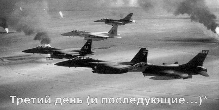 В ночь с 19 на 20 января 1991 г., то есть к концу третьего дня операции «Буря в пустыне», генерал Норман Шварцкопф и командование USAF приняли решение о смене характера войны в воздухе. Оно основывалось на данных о ходе воздушных атак на Ирак, особенно на тревожной статистике потерь самолетов. В первый день союзники потеряли сбитыми и списанными в результате повреждений 17 самолетов. Во второй день – только 3 машины. Зато на третий день потери возросли до 7 самолетов (один F-4G, один Tornado GR.1A, три F-16C, один F-14A и один F-15Е). Такие потери были признаны неприемлемыми. Анализ показал, что большинство самолетов было сбито во время полета на малой высоте, когда они несли груз обычных неуправляемых бомб. Стало ясно, что ПВО Ирака ожидала атак именно с малых высот и была к ним готова. С другой стороны, американские атаки, выполненные со средних высот, стоили значительно меньших потерь, а их результаты становились намного более заметными при использовании управляемых боеприпасов. Поэтому Шварцкопф и его штаб решили: начиная с четвертого дня войны ни один американский самолет над Ираком не должен летать ниже 5000 м. а «умные» бомбы и ракеты следует использовать так широко, как это только возможно.