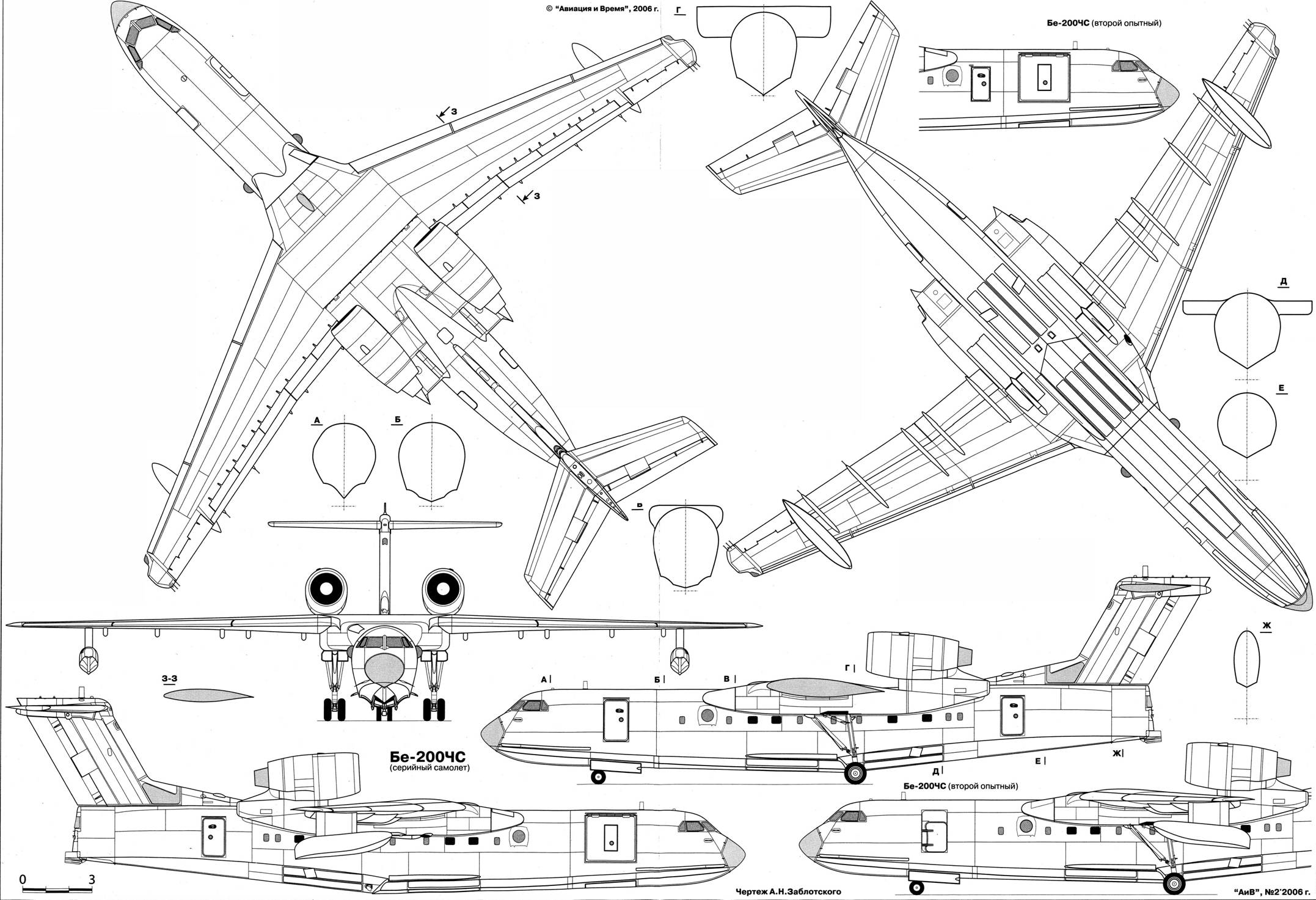 Самолет Бе-200ЧС – свободнонесущий высокоплан со стреловидным крылом, Т-образным оперением и убираемым в полете шасси. Основные конструкционные материалы – коррозионностойкие алюминиевые и титановые сплавы, а также легированные стали. Ряд элементов конструкции (носовой радиопрозрачный обтекатель, радиопрозрачные панели форкиля, обтекатели механизмов закрылков и пр.) выполнены из композиционных материалов. Болтовые и заклепочные соединения имеют антикоррозийную защиту (микрокапсулирование, установка на герметике и др.). Экипаж – 2 пилота.