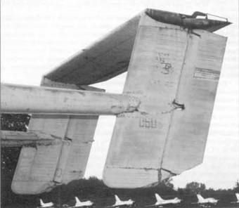 Хвостовое оперение – свободнонесущее, оснащено форкилем и управляемым стабилизатором. Горизонтальное оперение трапециевидное, вертикальное имеет постоянную хорду. Стабилизатор и киль двухлонжеронной конструкции, имеют углы стреловидности по передним кромкам 30'. Стабилизатор двумя шарнирными узлами присоединен к заднему лонжерону киля и с помощью механизма управления может отклоняться в пределах от +4' до -10'. Рули высоты и направления выполнены с осевой аэродинамической компенсацией.