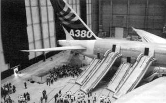 26 марта в Гамбурге (Германия) на заводе Airbus состоялся этап сертификационных испытаний самолета А380 по аварийной эвакуации пассажиров. 853 пассажира и 20 членов экипажа, находившихся на борту лайнера, покинули его за 78 секунд при норме 90 секунд. При этом 40% пассажиров составляли женщины, 35% – люди старше 50 лет, а в роли детей младше двух лет выступали три куклы, сделанные в натуральную величину. Эвакуация проводилась а полной темноте, использовалась только половина из 16 аварийных выходов самолета. Заранее не было известно, какие из них будут доступны для эвакуации. Несмотря на то, что в ходе покидания самолета 33 человека получили травмы, а один даже сломал ногу, Европейское агентство по авиабезопасности (EASA) и Федеральная администрация США (FAA) официально подтвердили успешное выполнение эвакуации.