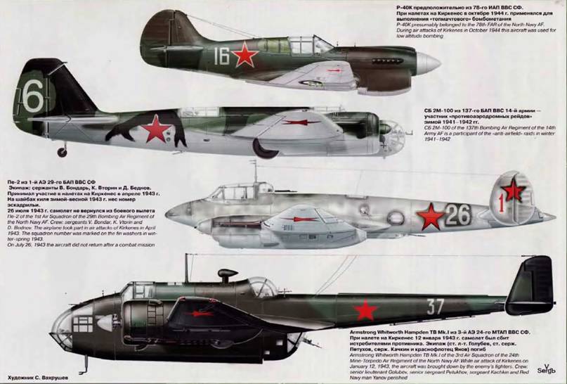 29 мая окрестности Киркенеса интенсивно обрабатывали, как авиация СФ, так и приданные флоту авиачасти Около 17.00 в результате бомбежки Хебуктена было убит о 3 человека. Кто нанес этот удар, нам установить не удалось. В полночь аэродром атаковали самолеты ВВС 14-й армии Пять Пе-2 под прикрытием 14 Томагавков сбросили с высоты 3800 м двенадцать ФАБ100 и столько же ФАБ-50 По данным противника, был незначительно поврежден транспортный самолет Кодрон С445 (зав. N1 363) из I. SIG5 и сгорел жилой барак Наши потери составили один Р-40, сбитый в воздушном бою 11 июля три Пе-2 под прикрытием четырех ЛаГГ-3 сбросили с высоты 5800 м 36 ФАБ-100 Немецкие источники сообщают, что был поврежден Юнкерс-88 и сгорело 30 емкостей с горючим