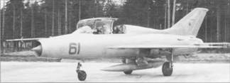 Начиная с 1971 г. в производство на том же заводе пошел МиГ-21УМ (Е-6УМ или изделие 69 ) Основные отличия его от предшественника заключались в установке двигателя Р-13-300. нового автопилота АП-155 с автоматом увода с опасной высоты и прицела АСП-ПФД-21 Для удобства обслуживания приборный отсек монтировался на выдвижной платформе МиГ-21 УМ оснащался доработанной системой аварийного сброса фонарей одной ручки С 1972 г по бокам носовой части фюзеляжа стали устанавливать датчики угла атаки, а в кабинах – соответствующие индикаторы, что способствовало повышению безопасности полета До 1985 г. выпустили 1133 caмолета МиГ-21УМ В НАТО они назывались также Mongol-B