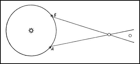 Посмотрите на рис. 7. Большой круг на этом рисунке изображает путь, который Земля проходит вокруг Солнца в течение года. Маленький кружок в центре этого круга изображает Солнце. В правой части рисунка видны две звезды: более близкая и более далёкая. Если Земля находится в месте, обозначенном на рисунке буквой