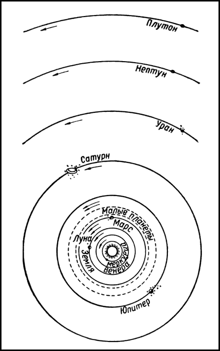 Рис. 13 показывает, в каком порядке планеты движутся вокруг Солнца. Наша Земля оказывается третьей планетой по расстоянию от Солнца. Первая от Солнца планета — Меркурий — в два с половиной раза ближе к Солнцу, чем Земля. Самая далёкая — Плутон — в 40 раз дальше от Солнца, чем Земля.