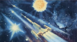 Как ты хорошо знаешь, Астер, антивещество, соприкасаясь с обыкновенным веществом, дает вспышку. И то и другое начисто превращается в свет. Соединяя антивещество с веществом в фокусе огромного рефлектора, который является движителем нашего звездолета, мы получаем мощные вспышки; они-то и толкают корабль вперед.