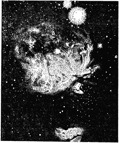 Но не одни только звёзды и планеты видны на ночном небе. Рассмотрите внимательно ту часть созвездия Ориона, которая находится под тремя его звёздами, расположенными в один тесный ряд и называемыми «поясом Ориона». Под средней из этих звёзд, ниже нескольких слабых звёздочек, вы заметите небольшое светлое пятнышко. Это — так называемая туманность Ориона (см. рис. 1). Она очень красива при рассматривании её в телескоп. Особенно много подробностей можно увидеть на её фотографических снимках (рис. 4).