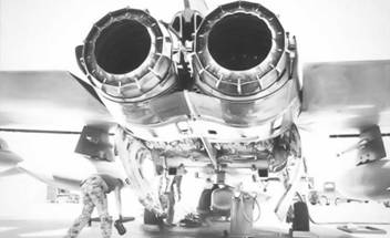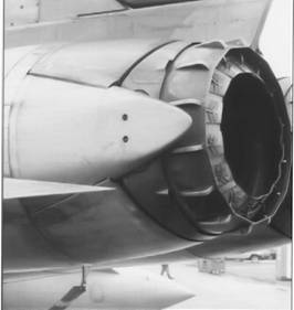 Препарированный двигатель RB199-34R и створки реверса левого двигателя в полетном положении