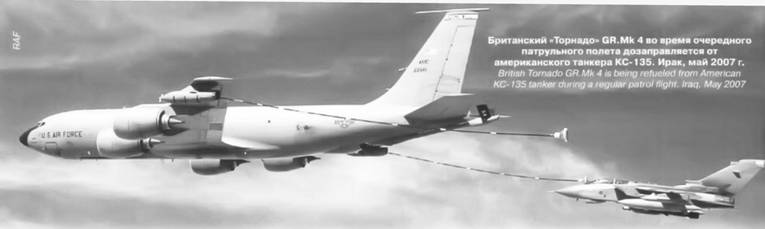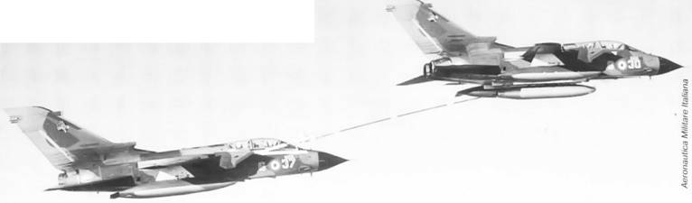 Второй прототип (per. № ХХ946) взлетел в Вартоне (Великобритания) 30 октября 1974 г. Его пилотировал уже знакомый нам Пол Миллет, но оператором был итальянец Петро Тревисан (Pietro Trevisan). Самолет предназначался для снятия летных характеристик в полном объеме, отработки дозаправки в воздухе. Он имел управляемые воздухозаборники и отличался небольшими противофлаттерными грузами на законцов-ках горизонтального оперения. РЛС по-прежнему отсутствовала. По результатам этих испытаний переднюю кромку стабилизатора сделали с переменной стреловидностью. На этой же машине установили накладную штангу для дозаправки в полете. В июле 1975 г. состоялась первая дозаправка «Торнадо» в воздухе.