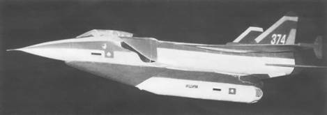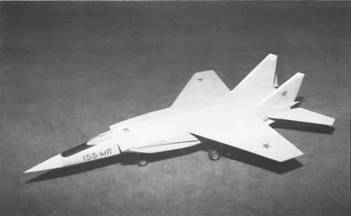 В 1971 г. для нового самолета утвердили схему с трапециевидным крылом по типу МиГ-25, но с корневыми наплывами и механизацией передней кромки («изделие 518-22»), По геометрическим размерам машина была близка к «двадцать пятому», напоминала его внешне, но не более того. В следующем году был подготовлен эскизный проект истребителя Е-155МП, получившего новый фирменный шифр «изделие 83-. Его рубеж перехвата должен был составить 700 км при полете с крейсерской скоростью 2500 км/ч (2,35 М) и 1200 км – на дозвуковой скорости. Чтобы обеспечить требуемую дальность и продолжительность полета, было решено оснастить истребитель (впервые в СССР) двухконтурными форсированными двигателями Д30Ф-6. Их разработкой с 1972 г. занималось ОКБ Генерального конструктора П.А. Соловьева, находившееся в Перми.