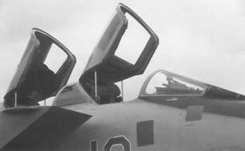 Открытые крышки фонаря кабин экипажа. Кабина летчика МиГ-31 и фрагмент ее левого борта (внизу)
