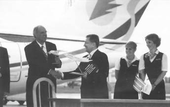 В 18.30 лайнер вылетел из Харькова обратно с первыми коммерческими пассажирами. Полет оставил самые благоприятные впечатления как от самого самолета, так и от уровня сервиса на борту. Через 40 минут Ан-148 приземлился в Борисполе, где к прибытию рейса VV 034 была устроена торжественная церемония, в которой приняли участие: Иосиф Винский, министр промышленной политики Владимир Новицкий, глава Госавиаадминистрации Александр Давыдов, Генеральный конструктор АНТК им. O.K. Антонова и председатель правления концерна «Антонов» Дмитрий Кива, Генеральный директор «АэроСвита» Костадин Ботев, другие официальные лица, представители СМИ. Завершилась церемония подписанием руководителями концерна «Антонов» и авиакомпании «АэроСвит» «Меморандума о сотрудничестве по программе производства и поставок воздушных судов отечественного производства» (на фото внизу). Согласно этому документу «АэроСвит» подтвердил свою заинтересованность в поставках и коммерческой эксплуатации 10 самолетов типа Ан-148 и Ан-158 (дальнейшее развитие «сто сорок восьмого», рассчитан на перевозку 99 пассажиров) в течение 2010-12 гг.