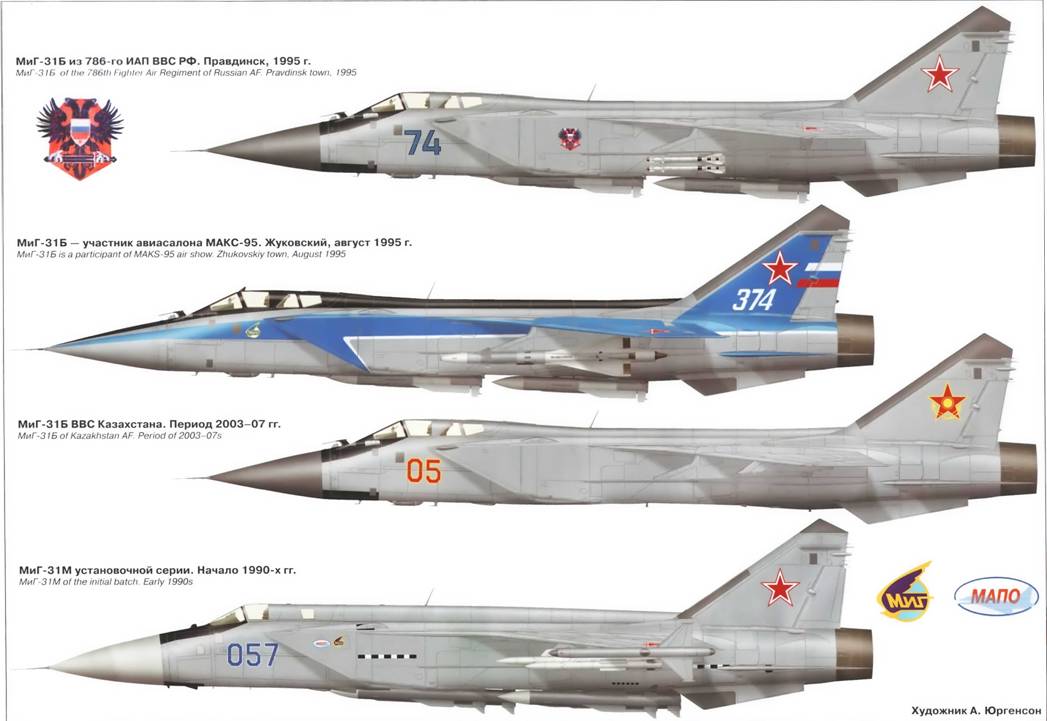 Первый серийный МиГ-31 (сер. № 0101), выпущенный в конце весны 1977 г., имел голубой бортовой номер «011». На нем не устанавливалось радиолокационное оборудование, т.к. он предназначался для аэродинамических, ресурсных и прочностных испытаний. Вторая машина (сер. № 0102, борт «012»), выпущенная в Горьком осенью того же года, была оборудована полностью и предназначалась для испытаний всего комплекса. Вторая серия насчитывала 3 машины (сер. №№ 0201, 0202 и 0203, соответственно борта «201», «202» и «203»), а третья – 5 самолетов (борта с «301» по «305»). Машины этих серий также предназначались для различных испытаний. Все бортовые номера первых серийных перехватчиков были голубыми.