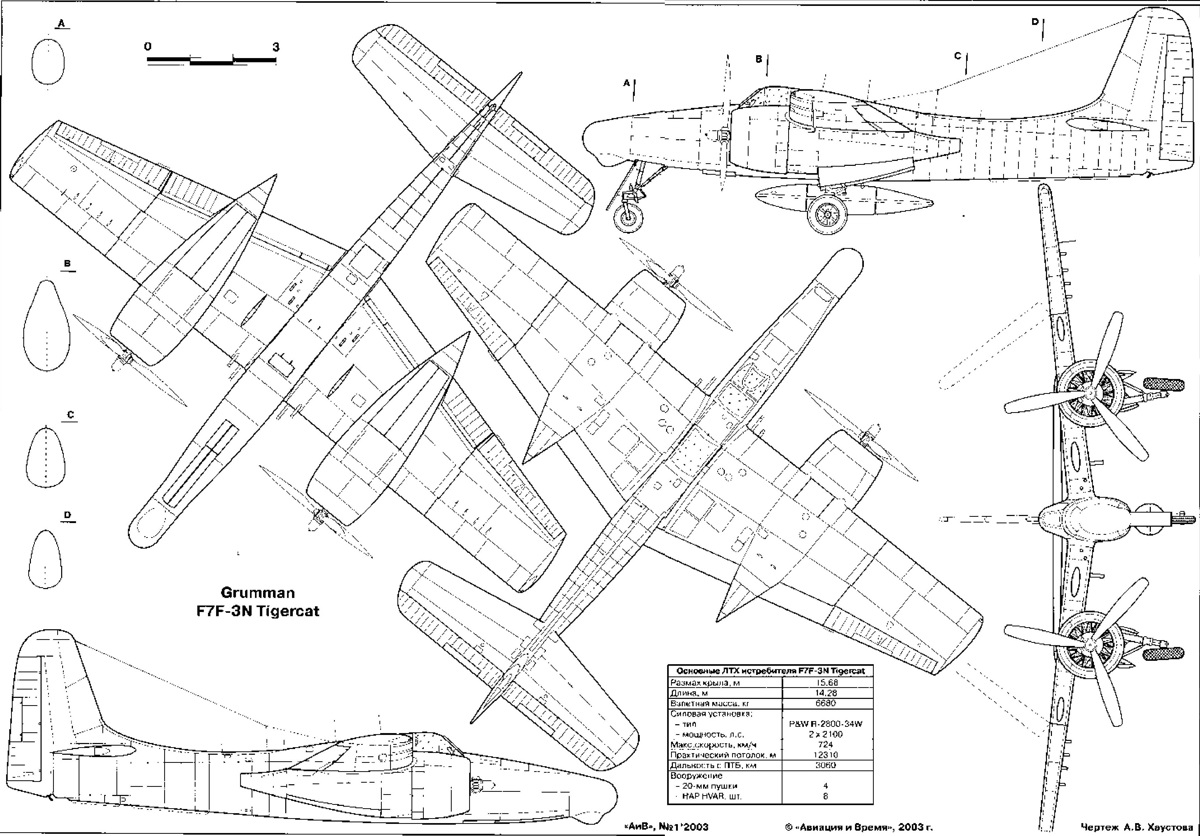 (3 экземпляра): невооруженный двухместный разведчик F7F-3P с фотокамерами в хвостовой части фюзеляжа (61 экземпляр); носитель радиоуправляемых мишеней F7F-3K (переоборудован, как минимум, один самолет). Самым массовым из "троек" и наиболее многочисленным из всего семейства "Тайгеркэтов" стал ночной истребитель F7F-3N (106 машин). В его носовой части размещалась РЛС. экипаж состоял из двух человек, а вооружение только из крыльевых пушек.
