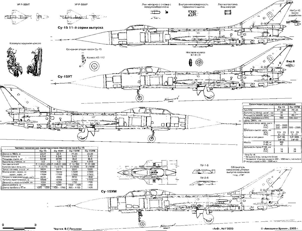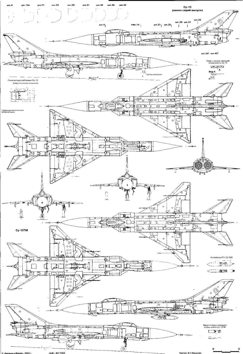 В такой обстановке в марте 1960 г возглавляемое П. О. Сухим ОКБ-51[2*] начало работы по созданию самолета, получившего заводской шифр Т-58. Новую тему оформили как дальнейшую модернизацию комплекса Т-3-8М (будущий Су-11 – подробное см. "АиВ", № 6/98). Самолет планировали оснастить РЛС с большими дальностью действия и углами обзора, а также ракетами с более высокими характеристиками. Разработчиком радара ОКБ-339 предлагались два варианта станции: "Орел-2" (главный конструктор Г. М. Кунявский) – модернизированную РЛС "Орел", предназначавшуюся для Су-11, и новую РЛС -Вихрь» (главный конструктор Ф. Ф. Волков) вариант станции -Смерч» для перехватчика Ту-28. С точки зрения "суховцев", общим для обоих радаров было то, что из-за больших размеров ни один из них не удавалось втиснуть в носовую часть Су-11. оснащенную осесимметричным воздухозаборником. Под станцию требовалось выделить всю носовую часть самолета, а следовательно, перейти к боковым заборникам. В итоге, новый перехватчик обрел классический вид реактивного самолета 2-го поколения.