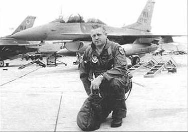 Пилот отдает дань уважения хорошему самолету. Ярослав Скалько после полета на F-16. Авиабаза Нелас (США), апрель 1992 г.