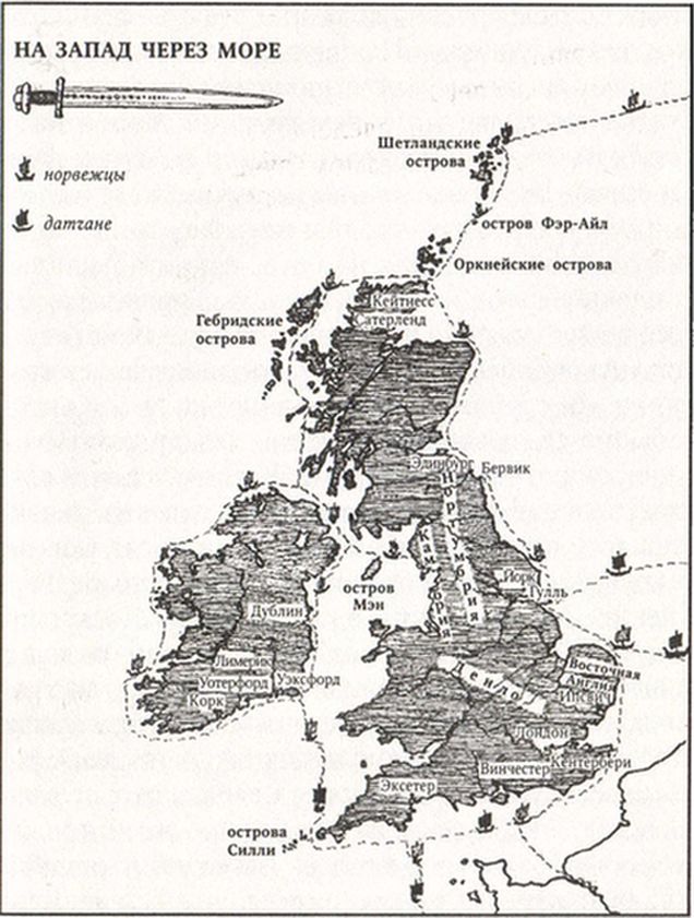 Крайне удобным для длительных стоянок были группы островов близ Шотландии: Оркнейские и Гебридские острова, располагавшиеся на пути к Британии. Оркнейские острова играли роль естественного пристанища на полпути из Норвегии к западному побережью. Они были захвачены как раз незадолго до того, как черные корпуса кораблей и темно-красные паруса на горизонте заставили колокола английских аббатств забить тревогу.