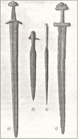 Мечи и наконечники стрел викингов: а) меч, инкрустированный на гарде и навершии медью, серебром и бронзой. Ок. 1000 г. н. э. Найден на реке Уитэм, неподалеку от Монкс Аббей, Линкольн; б) наконечник стрелы, найден в Лондоне; в)наконечник стрелы, найден в Темзе; г)меч, инкрустированный на гарде и навершии серебром, обвитый серебряной проволокой на рукояти. X в. Найден в Темзе, близ Темпля. Фотография. Британский музей