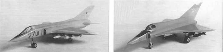 Представленный на конкурс микояновский штурмовик, известный под обозначением МиГ-27Ш и создаваемый на базе истребителя МиГ-21, предполагалось оснастить стреловидным крылом увеличенной площади. На 13 точках внешней подвески самолет должен был нести до 5500 кг различного вооружения. Характерный облик этой машине придавали боковые нерегулируемые воздухозаборники и приплюснутый «крокодилообразный» нос, обеспечивавший хороший обзор вперед-вниз. Весной был построен натурный макет этого полета В дальнейшем, основываясь на ; г: эма обнадеживающих результатах испы- -аний экспериментального МиГ-21 И, со- ланного в рамках программы Ту-144 и выполненного по схеме «бесхвостка» с оживальным крылом, было решено реализовать "одобную компоновку и на МиГ-27Ш. Самолет предполагалось оснастить двумя двигателями, мощным бронированием и большим числом узлов внешней подвески. Однако МиГ-27Ш так и остался на бумаге. Легкий боевой самолет-бесхвостка не нашел поддержки в ЦАГИ, да и сам Микоян более склонялся к крылу изменяемой геометрии, отработанному применительно к истребителю МиГ-23. Кроме того, создание фактически новой машины (а от исходного МиГ-21 на ней практически ничего не оставалось) требовало больших финансовых за- -рат. Не последнюю роль в судьбе проекта сыграло и то, что военные, остро заинтересованные в скорейшем доведении до требуемых кондиций МиГ-23, крайне негативно реагировали на работы, распылявшие силы ОКБ Микояна.