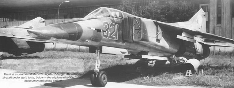 Прототип истребителя МиГ-23, опытный самолет «23-11/1», совершил первый полет 26 мая 1967 г. Четвертую по счету опытную машину, «23-11/4», выполнили в варианте истребителя-бомбардировщика и передали на летные испытания летом 1969 г. По конфигурации планера она была идентична истребителю, но вместо РЛС оснащалась еще не комплектной прицельной системой «Сокол-23», поэтому в носовой части не стали выполнять окно под лазерный дальномер.