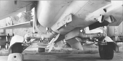 Основные опоры шасси и обтекатель пушки ГШ-23Л самолета МиГ-23БН.