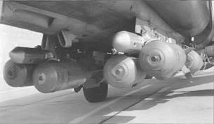 В состав вооружения самолета вошли также практически все средства поражения «воздух-поверх- ность», имевшиеся тогда на вооружении фронтовой авиации. В частности, под крылом и фюзеляжем можно было подвесить до четырех блоков УБ-16-57УМП или УБ- 32А, каждый из которых вмещал, соответственно, 16 или 32 ракеты С-5 калибром 57 мм. Другой вариант вооружения включал 4 тяжелые 240-мм НАР С-24 массой по 235 кг. Они могли комплектоваться ударным взрывателем В-24А или радиовзрывателем РВ-24 «Жук», который срабатывал в воздухе над целью. Позже в арсенал самолета вошли блоки Б-8М (до четырех штук), каждый из которых снаряжался двадцатью мощными 80-мм НАР С-8. Самолет мог нести до 3000 кг бомб на двух подкрыльевых и четырех подфюзеляжных узлах подвески (два дополнительных узла были размещены в хвостовой части, за нишами основных опор шасси). Важным новшеством, внедренном на МиГ-23Б, стали многозамковые балочные держатели, разработка которых началась в СССР в 1967 г. на основе анализа опыта американцев, полученного во Вьетнаме. На МиГ-23Б использовали держатели МБДЗ-У2Т-1 под авиабомбы калибром до 500 кг, а также МБД2-67У для меньших боеприпасов. В результате самолет получил возможность нести шесть 500-кг авиабомб или восемь по 250 кг. или 18 «соток».