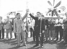 23 мая в Харькове в торжественной обстановке авиакомпании «Мотор Сич- был передан пятый серийный Ан-140 (зав. №03-03). Таким образом, уже третий авиаперевозчик в Украине взял и эксплуатацию самолет итого типа. Сделка состоялась е рамках заключенного я нынешнем году прямого контракта между двумя ведущими украинскими авиастроительными предприятиями – ХГАПП и ОАО -Мотор Сич- Как подчеркнул на церемонии передачи Генеральный директор ХГАПП П. О. Науменко, такие договоры -позволяют расширить формы сбыта отечественной авиапродукции. Украинские компании могут покупать машины не только по лизингу-. На фото: Генеральный директор ХГАПП П.О.Науменко (справа) вручает символический ключ от самолета Ан-140 директору авиакомпании Мотор Сич- В.С.Широчкину.