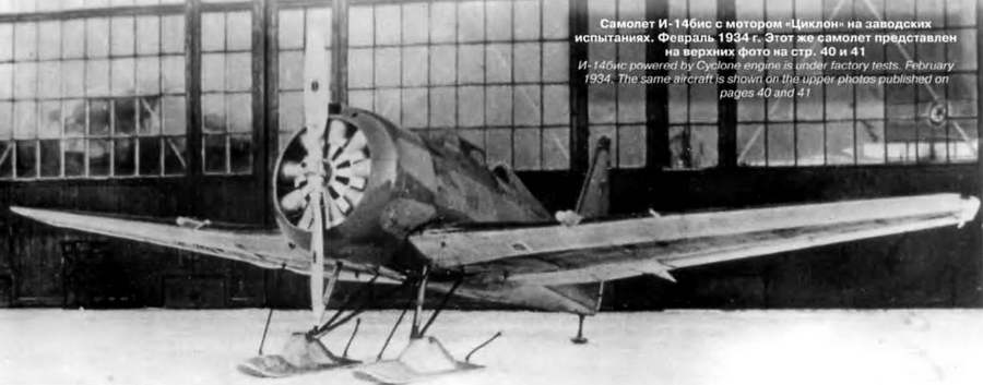 5 февраля 1934 г. «дублер» сдали на испытания – заводские и Государственные одновременно. Самолет летал на лыжном шасси. Пилотировал его летчик-испытатель А.И. Филин, впоследствии начальник НИИ ВВС. Большая мощность двигателя у земли и улучшенная аэродинамика сказались на характеристиках истребителя. На малых высотах летные данные улучшились: скорость на высоте 1000 м поднялась сразу на 50 км/ч, уменьшилось время виража, возросла скороподъемность. Но зато с подъемом на высоту показатели ухудшились: практический потолок понизился, а на 5000 м И-14бис проигрывал первой машине по скорости почти на 40 км/ч. В ходе испытаний выявился перегрев двигателя, на некоторых режимах возникала заметная тряска. Тем не менее, уже на предварительном этапе испытаний сделали вывод: «… выявленные летные качества самолета позволяют дать заключение о необходимости начала серийной постройки…».
