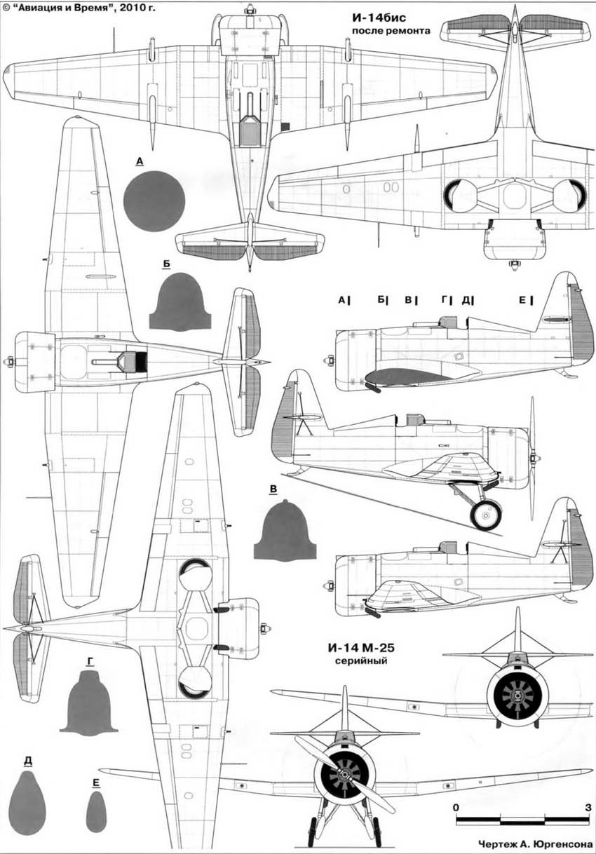 Этот самолет, И 14бис (в документах еще встречаются обозначения И-14Д и И – 14РЦ), начали строить в июле 1933 г. Ведущим инженером по «дублеру» назначили НИ. Фадеева. Второй самолет довольно существенно отличался от первого. Во-первых, переделали крыло. Поперечное V уменьшили до 4°. конструкцию лонжеронов не изменили, а вот нервюры переработали. Сильно переделали центроплан, поскольку перешли к другой схеме уборки шасси: раньше основные опоры складывались к оси самолета, а теперь – по размаху крыла. Соответственно их узлы крепления разместили практически на ширине фюзеляжа, а ниши для колес переместили к стыку центроплана и консолей. Механизм уборки и выпуска тоже стал совершенно иным – чисто тросовым, без гидравлики. Старомодная гофрированная обшивка крыла исчезла, ее сменил гладкий дюралевый лист толщиной 0,5 мм, приклепанный к каркасу потайными заклепками. На задней кромке крыла разместили четыре секции посадочных щитков. Изменилась и конструкция оперения. Киль стал отъемным, с креплением к стыковочным узлам на шпангоутах фюзеляжа. Гофрированную обшивку стабилизатора заменили гладкой. Самолет оснастили американским двигателем Райт «Циклон» SR- 1820-F2, менее высотным, чем «Меркьюри», но развивавшим большую мощность на малых и средних высотах. Винт применили также американский – «Гамильтон стандарт», дюралевый, диаметром 2.97 м. Установили более удобный, сдвигавшийся вперед фонарь кабины. И. наконец, на И-14бис смонтировали две ДРП типа АПК-11с пневмоперезарядкой и боезапасом по 25 снарядов на ствол.