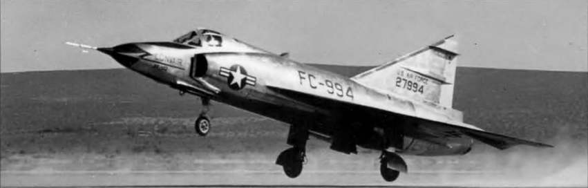 Новые данные подтверждали полученные при испытаниях имевшего аналогичную аэродинамику XF-92 и при более ранних продувках. Они буквально кричали о том, что сверхзвук этой машине не покорится вследствие резкого возрастания волнового сопротивления в трансзвуковой области. И все же инженеры фирмы упорно продолжали создавать перехватчик в первоначальной конфигурации, игнорируя объективные данные. Надеялись на чудо? На то, что более мощный двигатель все-таки разгонит самолет до требуемой скорости? Сейчас уже трудно судить, чем руководствовались разработчики в своих действиях, чуть не поставивших на программе жирный крест, но факт остается фактом. Лишь в середине 1953 г.. видя всю бесперспективность дальнейшей работы, конструкторы начали искать решение проблемы, и то, по утверждению известного авиационного историка Джо Бауджера (Joe Baugher), без энтузиазма. К сожалению, было очень поздно вносить какие-либо коррективы в уже строившиеся машины, поэтому первая десятка так и осталась в «дозвуковом» виде.