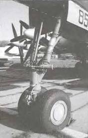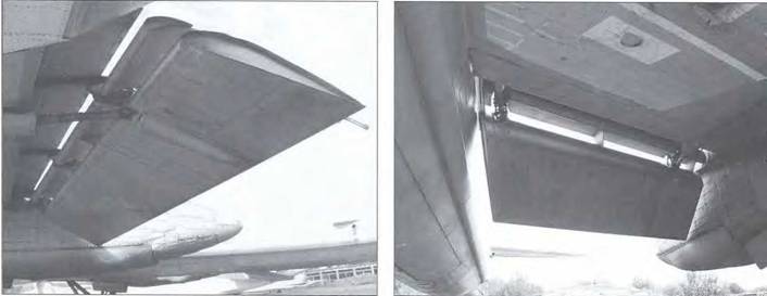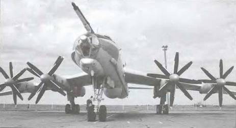 г . В результате на Ту-142 пришлось применить двухщелевые закрылки и новые основные опоры шасси с двенадцатиколесными тележками, снабженными колесами размером 1100x330 мм с давлением в пневматиках 4-4,5 кгс/см\ Новая тележка оказалась значительно больше, чем используемая на Ту-95, и потребовала значительного увеличения гондолы для ее уборки. На передней опоре шасси также установили новые расширенные колеса 1140x375 мм со сниженным давлением.