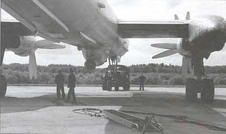 Силовая установкавключает четыре турбовинтовых двигателя НК-12МВ. оснащенных винтами АВ-60К. Каждый двигатель крепится на нулевом шпангоуте мотогондолы с помощью виброгасящих демпферов. Он имеет свою маслосистему с протектированным баком на 135 л. Кроме того, на двигателе установлены следующие агрегаты: два генератора постоянного тока ГСР-1800М, генератор переменного тока СГО-ЗОУ, воздушный компрессор АК-150НК, командно-топливный агрегат КТА-14Н, топливные насосы и др. Запуск двигателей производится от аэродромного источника постоянного тока с напряжением 27 В или автономно с помощью тур- бостартераТС-12М