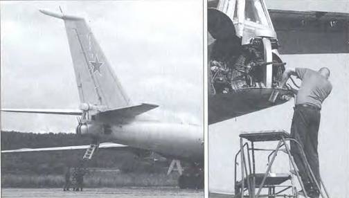 В хвостовой части фюзеляжа расположены: грузовой отсек II, над ним технический отсек VII, далее технический отсек VIII. Грузовой отсек II закрывается двумя створками. Вход в VII технический отсек – через дверь в шп. 58, вход в VIII технический отсек – через люк снизу, рядом с ним – люк антенны ДИСС и фотолюк. К хвостовой части фюзеляжа крепятся: хвостовое оперение, предохранительная опора шасси и задняя гермокабина с кормовой дистанционной установкой (КДУ), антенной прицельной РЛС «Криптон» и двумя блистерами.