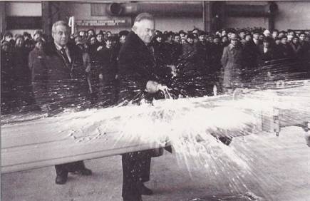 Во время торжественной выкатки первого Ан-124 О.К.Антонов разбивает традиционную бутылку шампанского